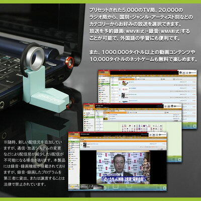 これがあれば世界中のインターネットテレビやラジオ、ミュージックビデオ、ネットゲームを思う存分楽しめます! 使い方も非常に簡単で、「Mega Cloud Link(メガクラウドリンク)」をパソコンのUSB端子に接続するだけ! インターネットTVの番組は国やジャンルから選択することができます。